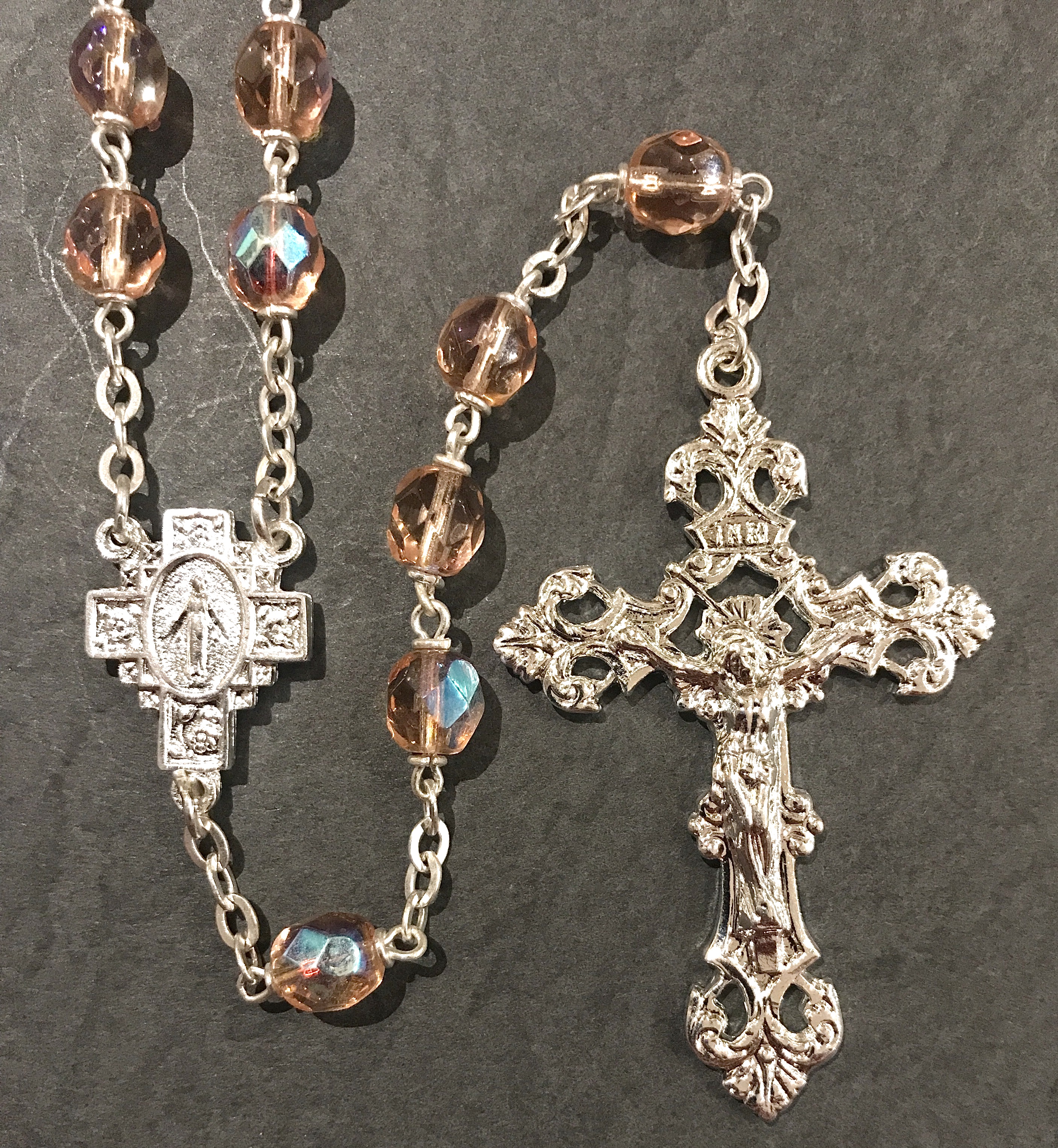 7mm ROSE AB FIRE POLISH LOC-LINK ROSARY WITH STERLING SILVER PLATED CRUCIFIX, CENTER, WIRE, CHAIN GIFT BOXED